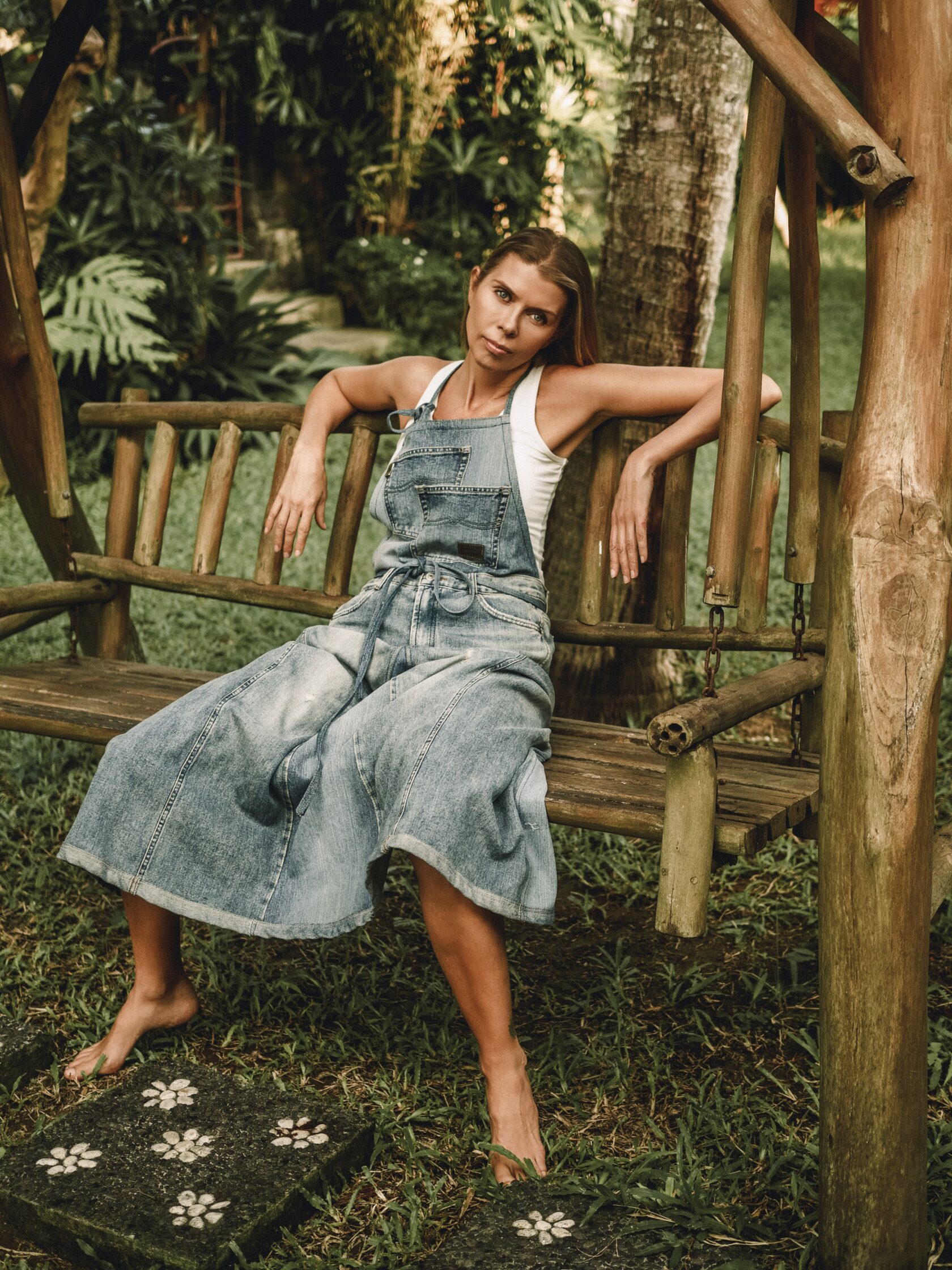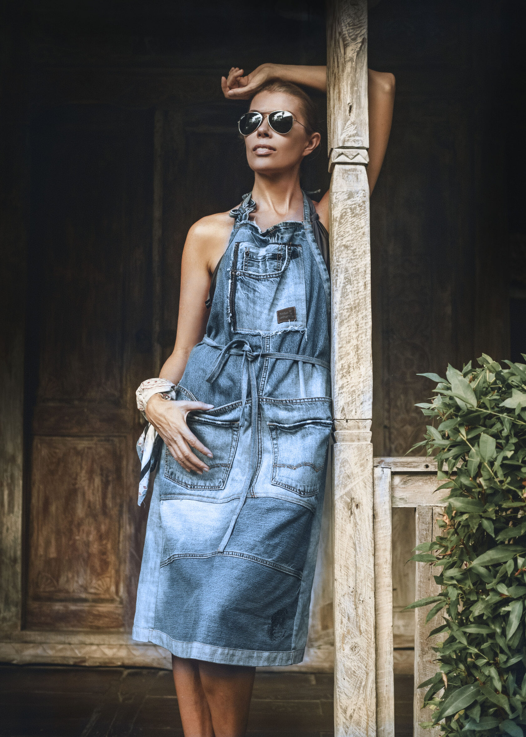All jeans are laundered and hand-crafted into a unique transformer denim apron-dress-overalls-skirt.